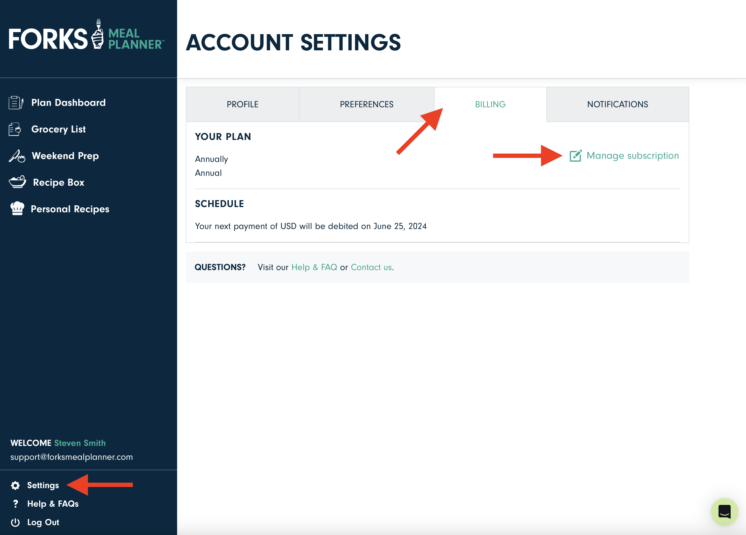 You can cancel your subscription from this menu. You will continue to retain access to Forks Meal Planner until the end of your billing cycle.
